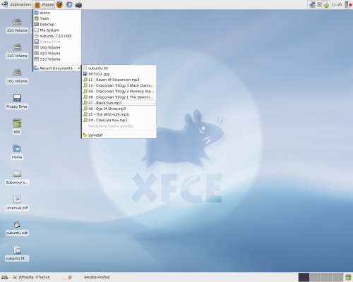 Grafická stránka ma priam ohromila. Xubuntu je modro-svetlosivo-tmavosivé. Spúšťanie a vypínanie je naozaj efektné radosť sa zapozerať. Tvorcovia si dali záležať aj na novom GDM. Po spustení prostredia XFCE som sa zamyslel. Je to vlastne XFCE? Vľavo hore sa okrem menu Applications nachádza aj menu Places. Napriek kompletne nainštalovanej slovenčine Applications aj Places majú svoje pôvodné mená. Nové menu places výrazne pripomína rovnomenné menu z Gnome len chýba možnosť Sieť a Hľadať. Tak či onak v XFCE to môže potešiť. A komu sa to nepáči, dá sa to vypnúť. Nasledovná zmena je pridanie Gnome pomocníka. Ten ukazuje rovnakú adresu, ako Firefox, vzdialený niekoľko pixelov. Takže to hodnotím trochu ako zbytočný ťah. okná programov nemajú po novom 3 tlačítka, ale až 5. Pribúda tlačítko na prekopírovanie okna do všetkých plôch, a tiež tlačítko na zrolovanie. Dvojklik do prostriedku, ktorý rieši túto požiadavku, nefunguje. Tango ikonky sú pekné, rôzne nové ikonky po paneloch tiež. Len akosi nie všetky vôbec sú, dajú sa nájsť miesta bez ikoniek alebo s ikonkami nevhodnými.