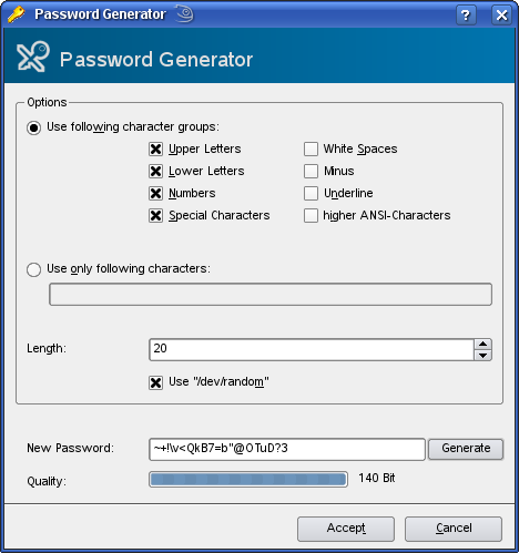 Ako už podľa nadpisu iste viete, program, ktorý som našiel, je KeePass. Plnohodnotné porty existujú pre OS Windows, Linux a MacOS, ďalšie existujú pre mobilné platformy. Pre všetky menované systémy existuje aj portable verzia (t.j. nesie si zo sebou všetky potrebné závislosti), čo mi umožnilo mať na USB kľúči heslá, ktoré môžem spravovať na ľubovoľnom PC. Ako šifrovaciu metódu môžete použiť niekoľkonásobný (môžete sami nastaviť koľko) 256bitový AES, alebo Blowfish. Generátor hesiel je zabudovaný s pokročilými možnosťami nastavenia, ako má vygenerované heslo vyzerať.