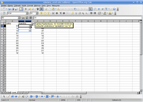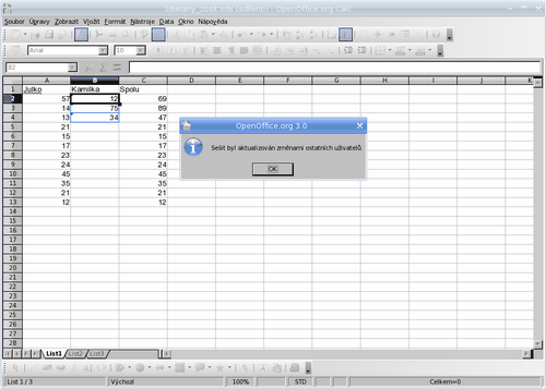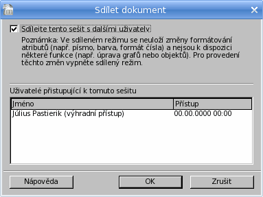 Z tomto pracovnom okne zaškrtávame alebo rušíme zaškrtnutie okienka „Sdílejte tento sešit s dalšími uživately“. Ako upozorňuje toto okno, v režime zdieľania nie sú dostupné všetky možnosti modulu Calc – nemôžete meniť atribúty písma (farba, formát a pod.) a nie sú prístupné funkcie pre prácu s objektami, ako je napríklad vkladanie grafov.