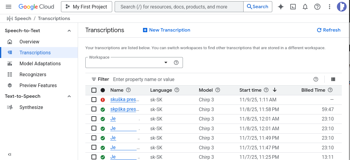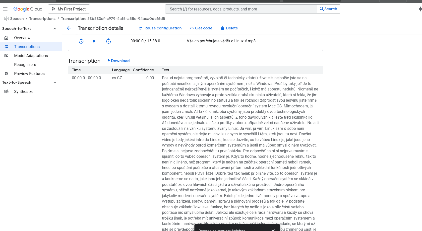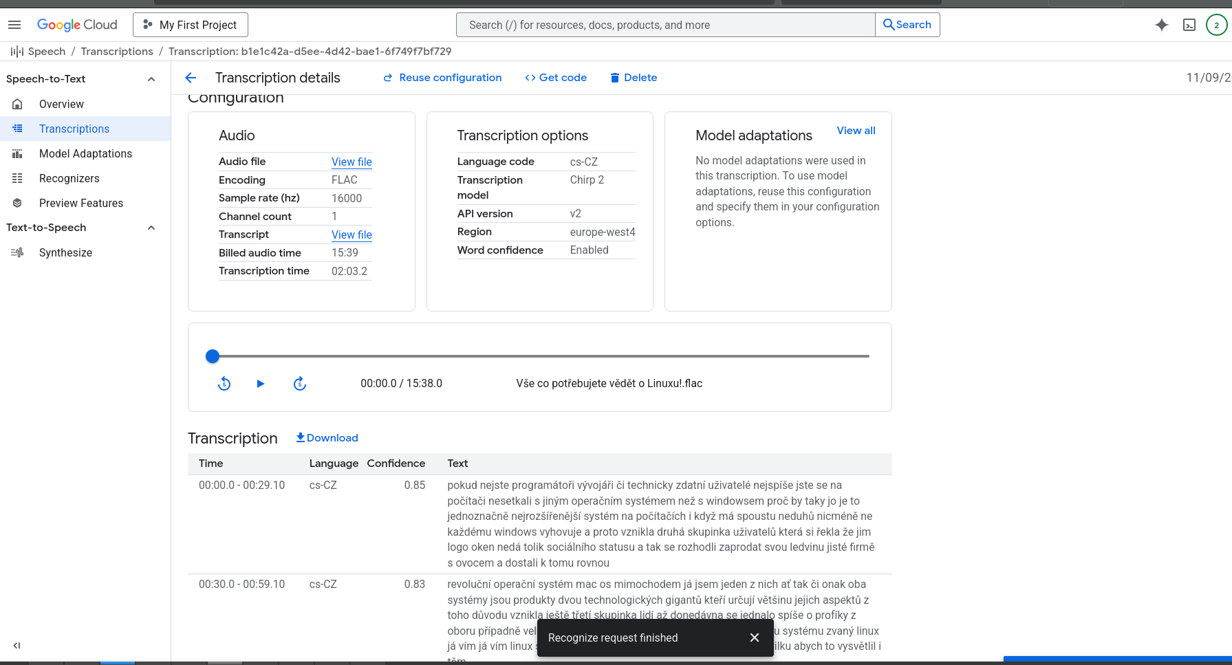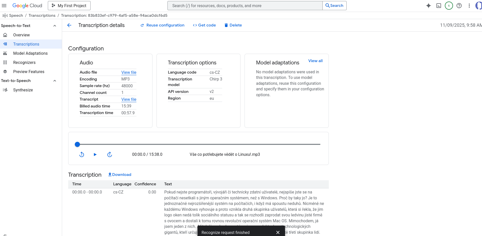 AI prevod Reči na Text. Recenzia. Google Cloud Console