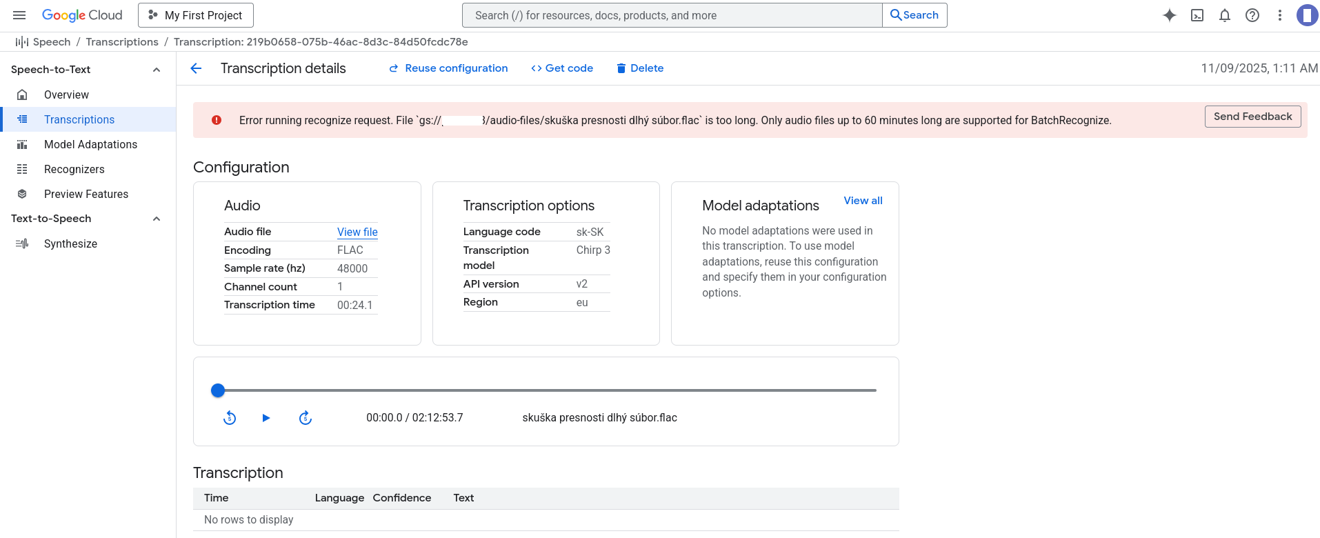 Chirp3 podporuje len súbory s maximálnou dĺžkou 60 minút, čo je veľmi nepohodlné, ak musí rozdeľovať vstupný audio súbory a následne napájať výstupný text. Zbytočne to zaberie veľa času