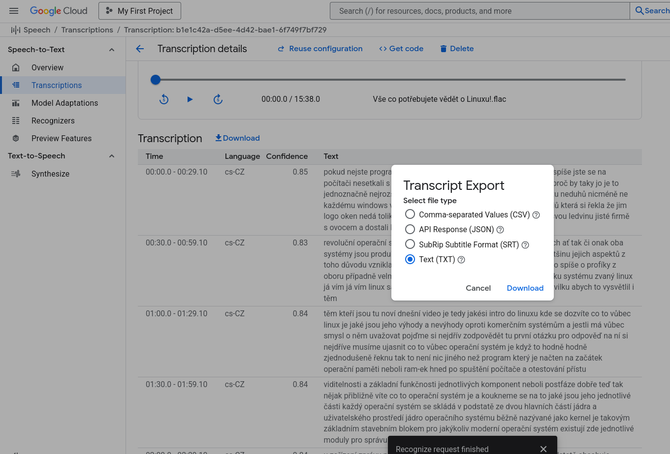AI Prevod Reči na Text. Recenzia. Google Cloud Console