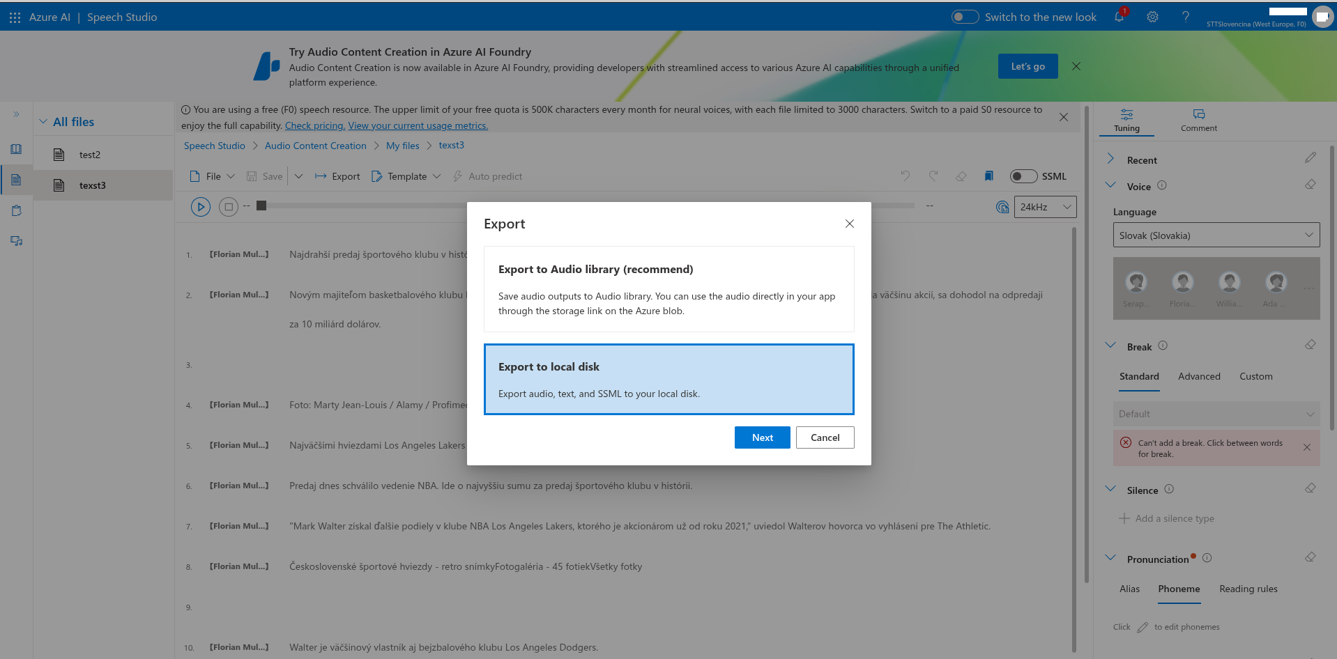 Aká je cena služby Text to Speech Microsoft Azure? Program zdarma: 0,5 milióna (500 000) znakov mesačne.