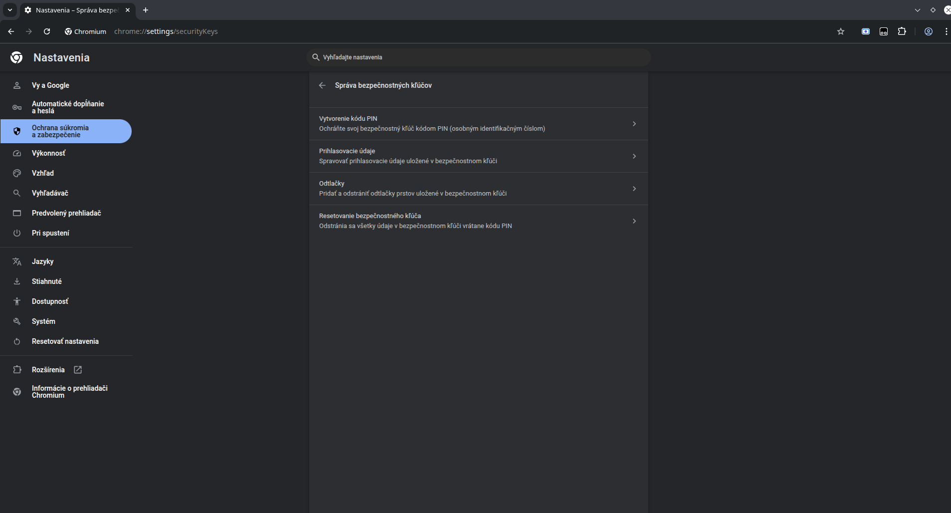 V Chromium nastavenia:Nastavenia -> Súkromie a zabezpečenie -> Zabezpečenie -> Spravovať bezpečnostné kľúče)