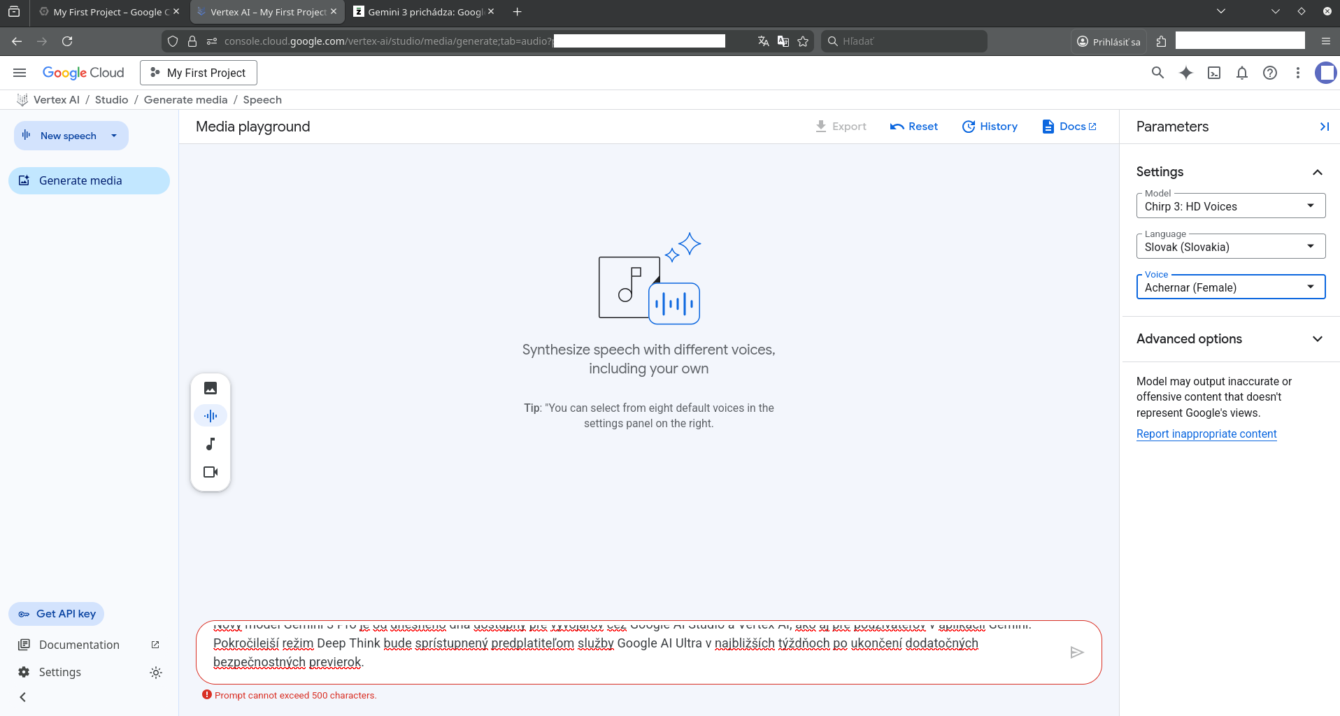Prečo sa zaoberať API keď existuje aj grafické rozhranie Vertex AI? Nevýhoda Vertex AI (odkaz tu) je to, že podporuje maximálne len 500 znakov čo je asi tak na štyri vety. Praktické využitie takmer žiadne.