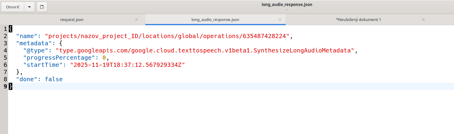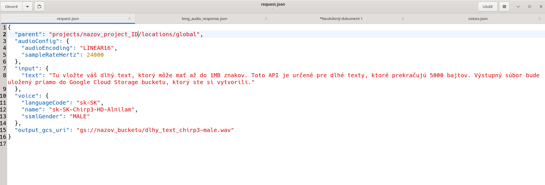 "text": "Tu vložte váš dlhý text, ktorý môže mať až do 1MB znakov. Toto API je určené pre dlhé texty, ktoré prekračujú 5000 bajtov. Výstupný súbor bude uložený priamo do Google Cloud Storage bucketu, ktorý ste si vytvorili."