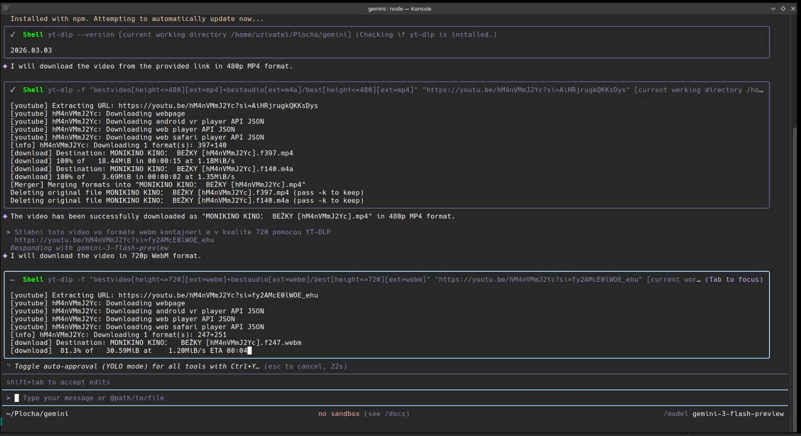 Z bezpečnostných dôvodov majte vlastný priečinok pre účel AI ako vidíte na videu. V koreňovom home folder by AI hypoteticky mala AI prístup k citlivým dátam. AI na základe dokumentácia sama podľa zadania vytvorí príkaz na stiahnutie videa cez YT-DLP. AI dokáže výborne pracovať s programami bez grafického rozhrania.