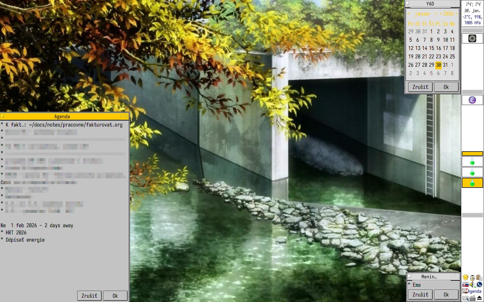 Na ľavej strane plochy je zobrazená Agenda — viac som o nej písal v článku Jednoduché plánovanie a agenda, nielen v Emacs-e. Vpravo dole sú vypísané meniny, po kliknutí pravým tlačidlom myši na tlačidlo Agenda na paneli.