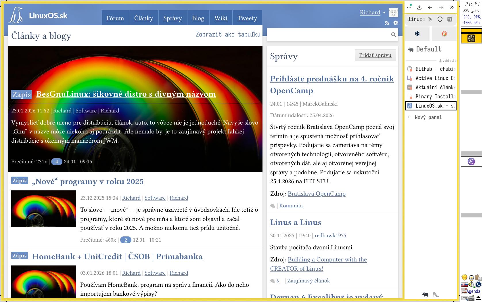 Skrátim to: IceWM dokáže mať len horizontálny panel, umiestnený na vrchu alebo spodku obrazovky. Neviem, či je to degeneráciou zraku, alebo inou formou prejavu „zubu času“, ale potrebujem svetlé témy a najlepšie sa sústredím na úzky výsek textu. Nemusí to byť nutne programátorských 70 - 80 znakov v riadku, ale niečo blízko toho.