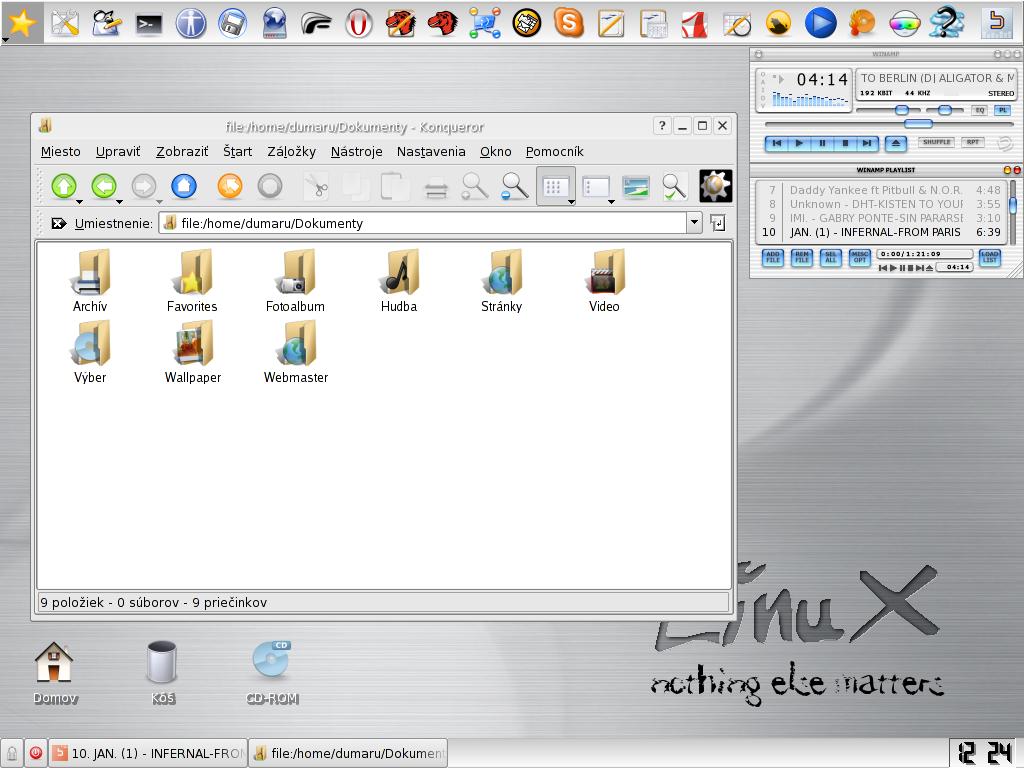 Download manažéry inštalujem stále ale je pravda, že ani neviem kedy som ich použil naposledy. Boli doby, keď som cez dial ťahal 700 mega za deň a pol a tam to bola povinnosť spolu s kontolou md5 súčtu (dnes 600 Mbit) pri ťahaní iso. A dobrý postreh s tým rokom 2012, predvolene sa v KDE používali Crystal ikony a ak sa nemýlim v niektorých distrách dokonca aj v GNOME. Wallpaper s Pulp Fiction som videl v rôznych obmenách, ten film je jednoducho geniálny a videl som ho x krát. A panel vľavo je vysoko návykový, ľudské oko číta štandardne aj obraz ako text zľava. Teraz nechávam panel väčšinou dole, prípadne hore keď spúšťam Linux z vituálky aby sa mi to nebilo s hostiteľom a bolo to prehľadnejšie.