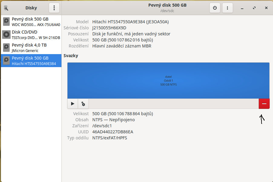 Zdravím, hledal jsem program na připojení ISO souborů. A nainstaloval jsem si Gnome Disk Utility. A hne jsem ho šel vyzkoušet. Připojení ISO proběhlo dobře. A hned jsem odpojil ISO a ve zbrklosti jsem pak hned zmáčkl červené tlačítko '-'. A odsouhlasil jsem smazaní disku. (Viz příloha) Aniž bych si všiml že jde o smazání externího disku. Asi po hodině jsem potřeboval otevřít nějaké dokumenty na tom externím disku. A na něm prý nic není. Prosím o radu jak vše na tom externím disku obnovit. Děkuji za jakoukoliv radu